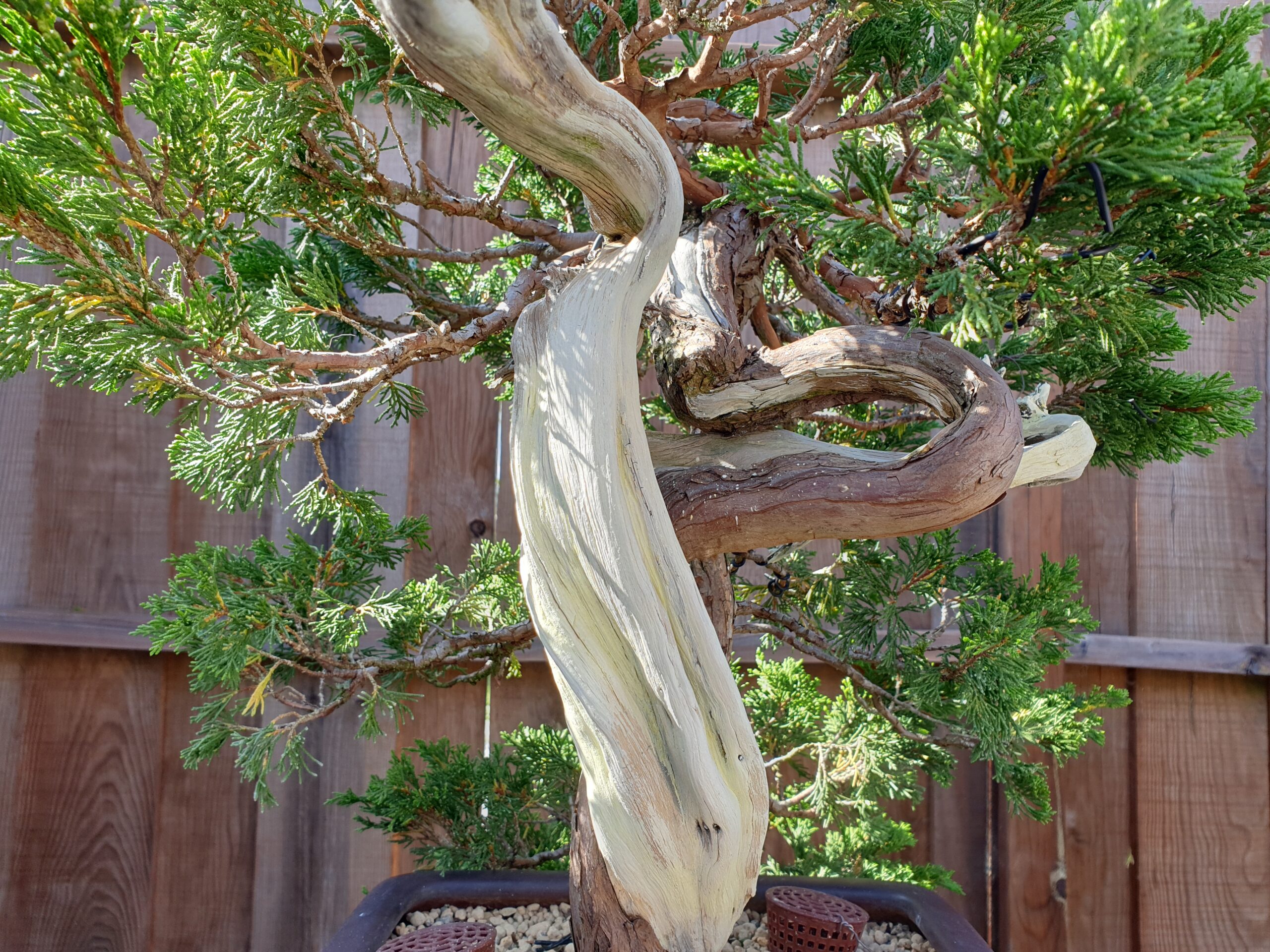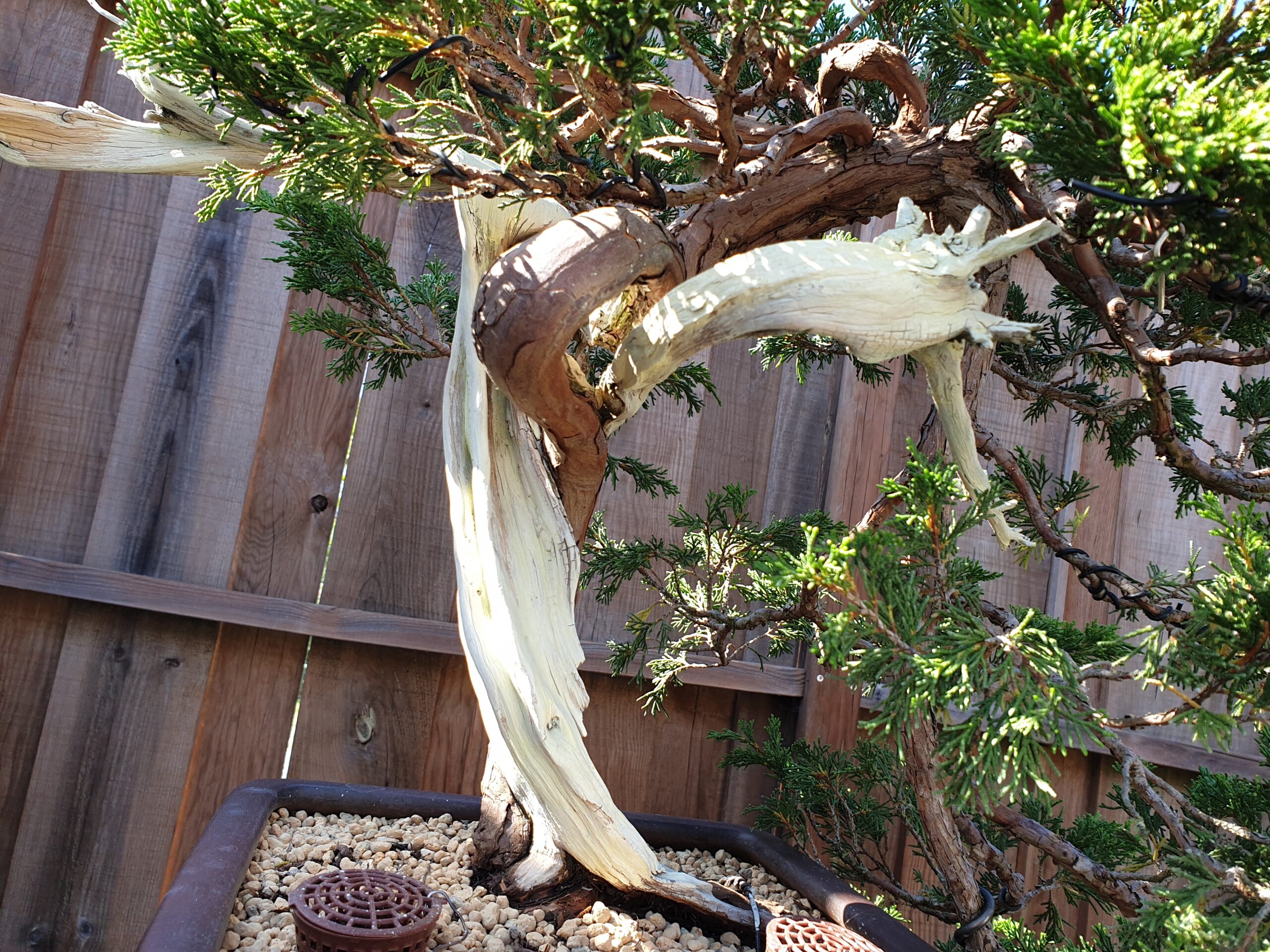 Ce qui différencie certainement le genévrier des autres essences en bonsai, c’est sa capacité à former des veines vivantes qui courent le long du bois mort. Cela est du au fait que les canaux de sève sont très compartimentés.
