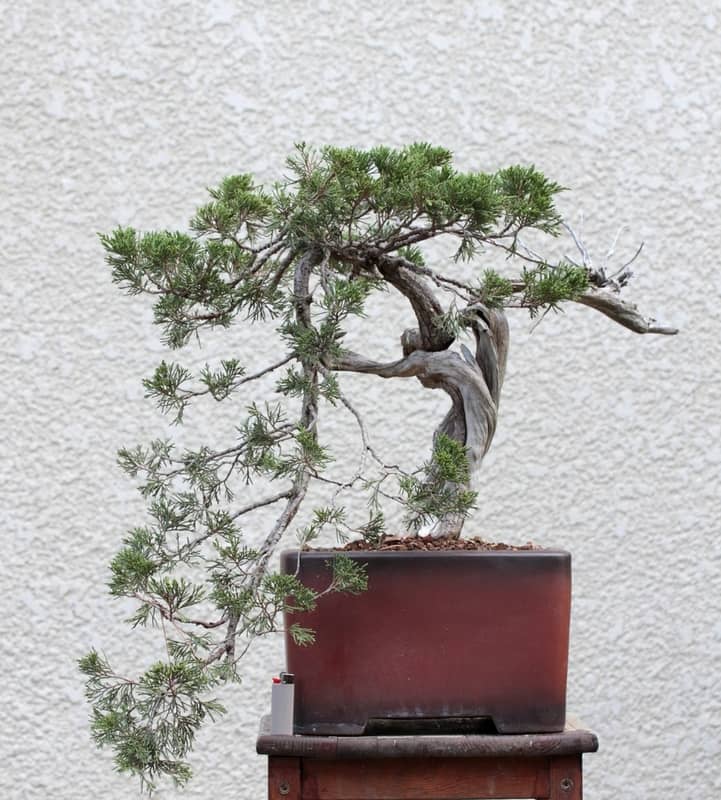 Lorsque l’on regarde un genévrier préparé pour une exposition de bonsai, ce qui saute aux yeux, c’est ce contraste entre le bois mort blanc, les veines vivantes bien rouges et le feuillage d’un vert profond. Il s’en dégage toute une symbolique de la vie qui se fraye toujours un chemin. Le tronc sinueux, tortueux, donne un effet dramatique !